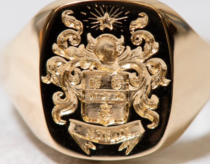 Once reserved for nobility, many now create their own ‘unofficial’ Coat of Arms outside the jurisdiction of the College of Arms, incorporating their own personal and familial symbols. Why not explore our Crest & Monogram search? To begin the process of designing a bespoke Rebus signet ring engraved with your very own custom Coat of Arms, please email info@rebussignetrings.co.uk or book an appointment at our Hatton Garden workshop or via Zoom.