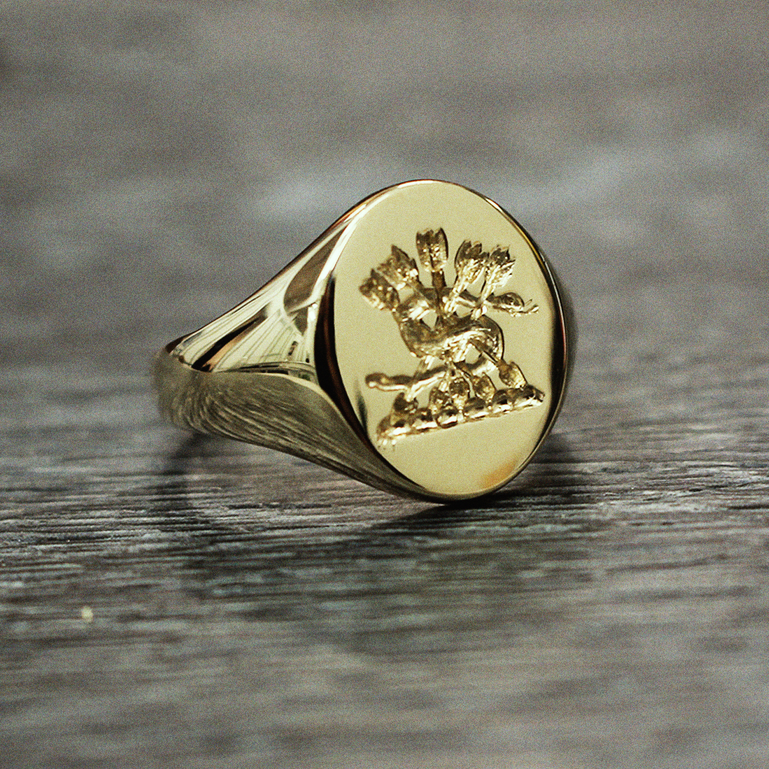 First I collect together additional reference materials relating to the brief to check any details, often including images and descriptions from specialist books and a trusty encyclopaedia. Then a quick sketch to check the composition works, fits the face of the ring and will look good when scaled down to the size of the ring. Then I get straight into drawing the finished design, often in pen. Whilst I draw, I think about the engraving process, I try to make sure that the marks made reflect the way engravers use their tools and imagine how the design will be worked into the metal.