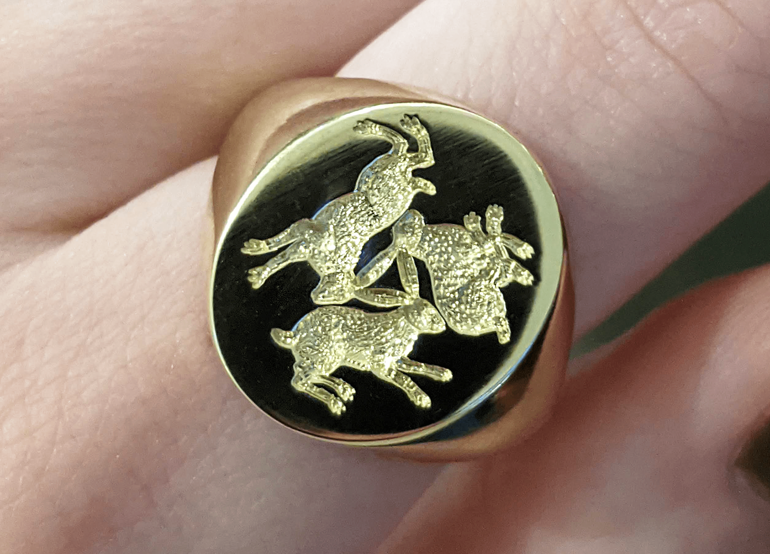 Following on from the introductory consultation with our client, it was agreed that we use an ancient motif found in Southwest England; an homage to the Rabbit, or the 'Tinners' Rabbits' as the symbol is known in Devon, an area that is close to our clients heart. The design is believed to have originated in China dating back to 580 AD and found its way through Europe to England via the spice route. Rebus artists created sketches of the three rabbits positioned on the signet ring, and our skilled team of jewellers and hand engravers began work, bringing the design to life.