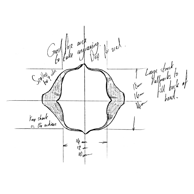 A shape inspired by the elegant period of 1920s Art Deco, bold with a soft curved scalloped edge. The unisex Century Ring is available in three different face sizes and is made to order in either platinum, 9ct, 14ct and 18ct yellow, rose and white gold. As with all Rebus jewellery, you can make this signet ring your own, fill it with sentiment and meaning, with a hand engraved personal symbol or message.