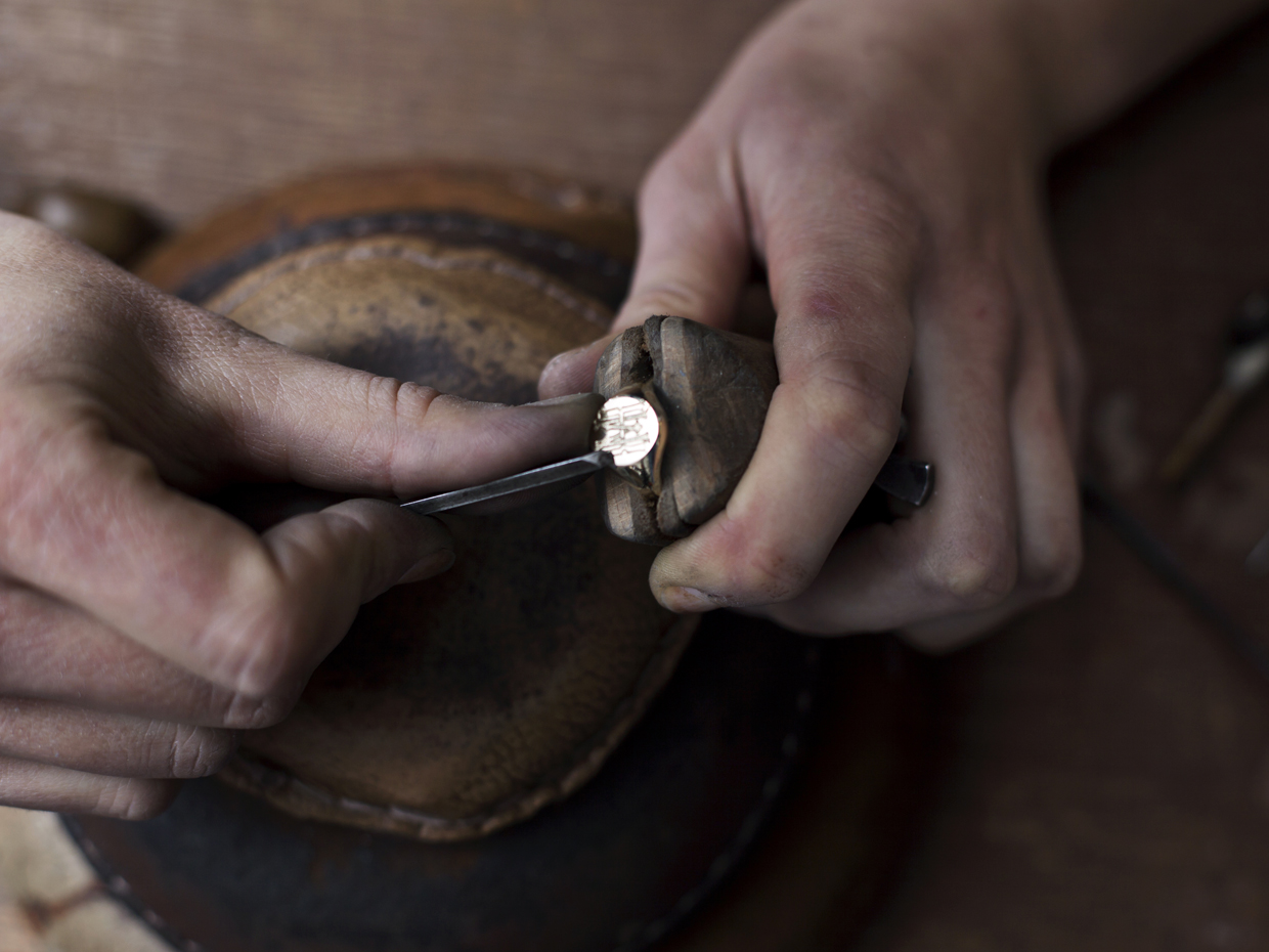 Our team of craftsmen use an array of very small chisels, known as gravers, it is these that pare away the metal to produce the desired symbol or effect. They are handmade and sharpened to produce different cuts and textures. It takes an enormous amount of experience just to make these tools, that have remained unchanged for hundreds of years.