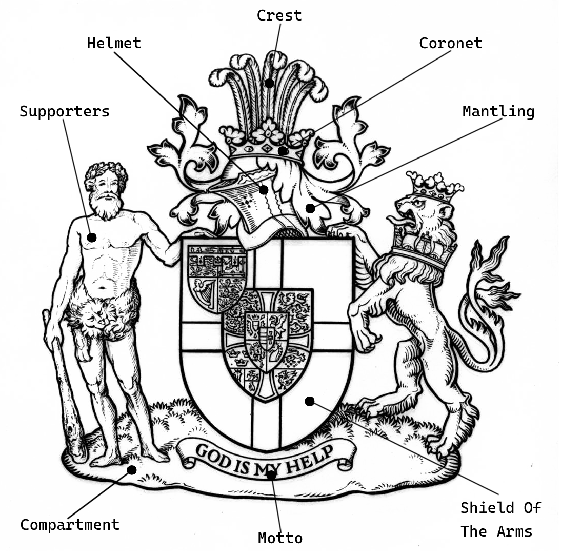 A coat of arms is the entire heraldic device that can include the mantling, a helmet, a crest, a motto and, in the case of peers and clan chiefs, a coronet and supporters. They are displayed on a shield, and together they identify the owner who has been granted the right to bear arms. A son will inherit his father's arms and quarter them with his mother's and so on, making some coats of arms very complicated.