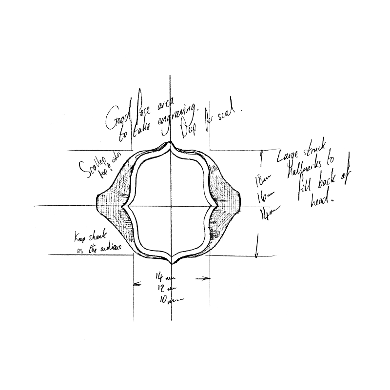 A shape inspired by the elegant period of 1920s Art Deco, bold with a soft curved scalloped edge. The unisex Century Ring is available in three different face sizes and is made to order in either platinum, 9ct, 14ct and 18ct yellow, rose and white gold. As with all Rebus jewellery, you can make this signet ring your own. Choose from a selection of semi-precious stones and fill it with sentiment and meaning, with a hand engraved personal symbol or message.