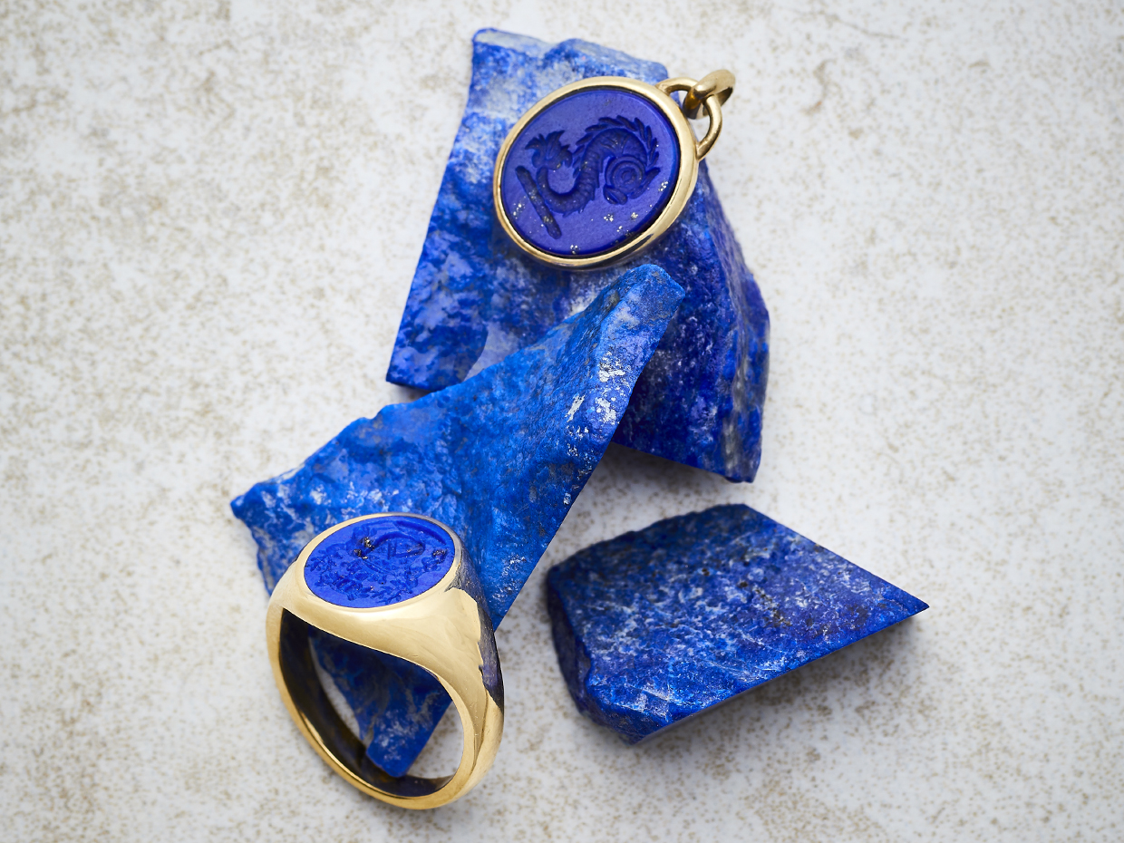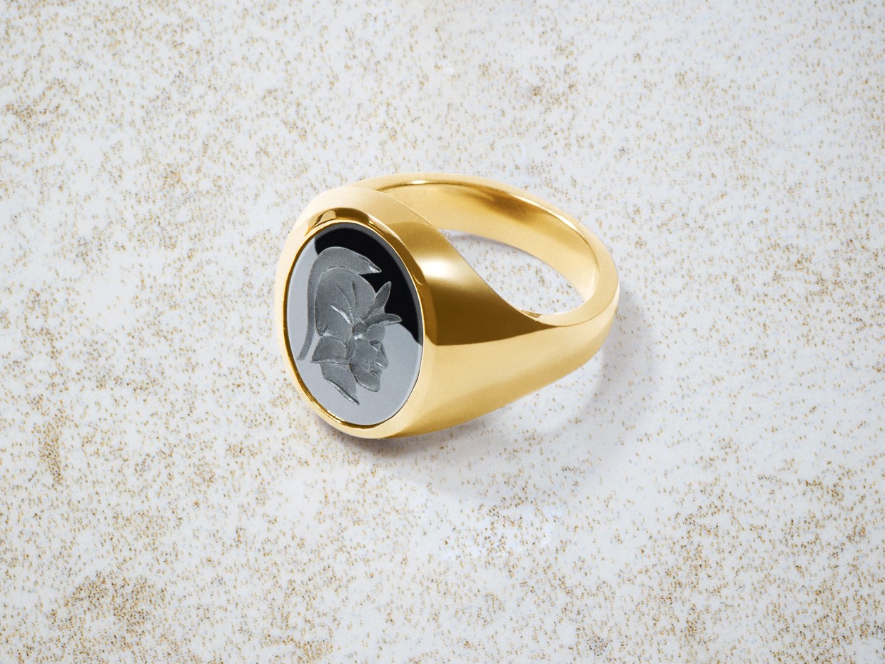 Use of Sardonyx appears in the art of Minoan Crete, notably from the archaeological recoveries at Knossos. Sardonyx comes in a wide range of natural colours and shades. The Sardonyx coloured bands are Sard (top layer), meaning colours other than the onyx (bottom layer), the combination of the two elements giving rise to its name. The colours we can offer in signet rings are petrol blue cutting through to black and creamy white cutting through to amber. The contrast between the stone layers once engraved makes for a striking seal engraving. These qualities made it a favourite with the ancient Romans, who believed that the virtue of stones could be increased if suitably engraved.