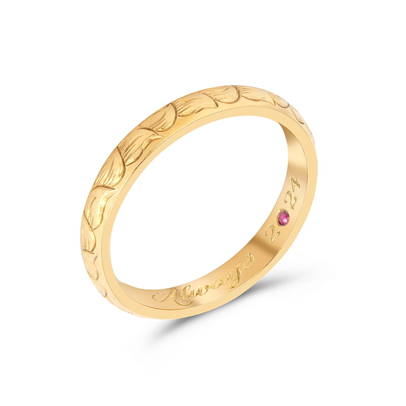 Our team of hand engravers can also deep carve patterns running around the outside of the bands, with our signature Laurel and Orange Blossom designs as options.